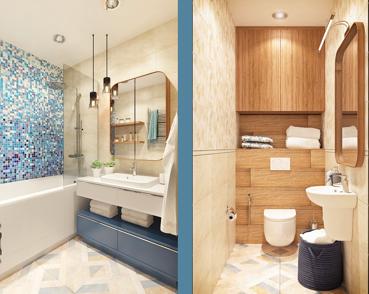 Bright blue tile is calming behind the soaking tub and there is a faint color on the floor tiles that compliment it. Wooden design is simple and sleek along with the other accents in this small, but organized bathroom.